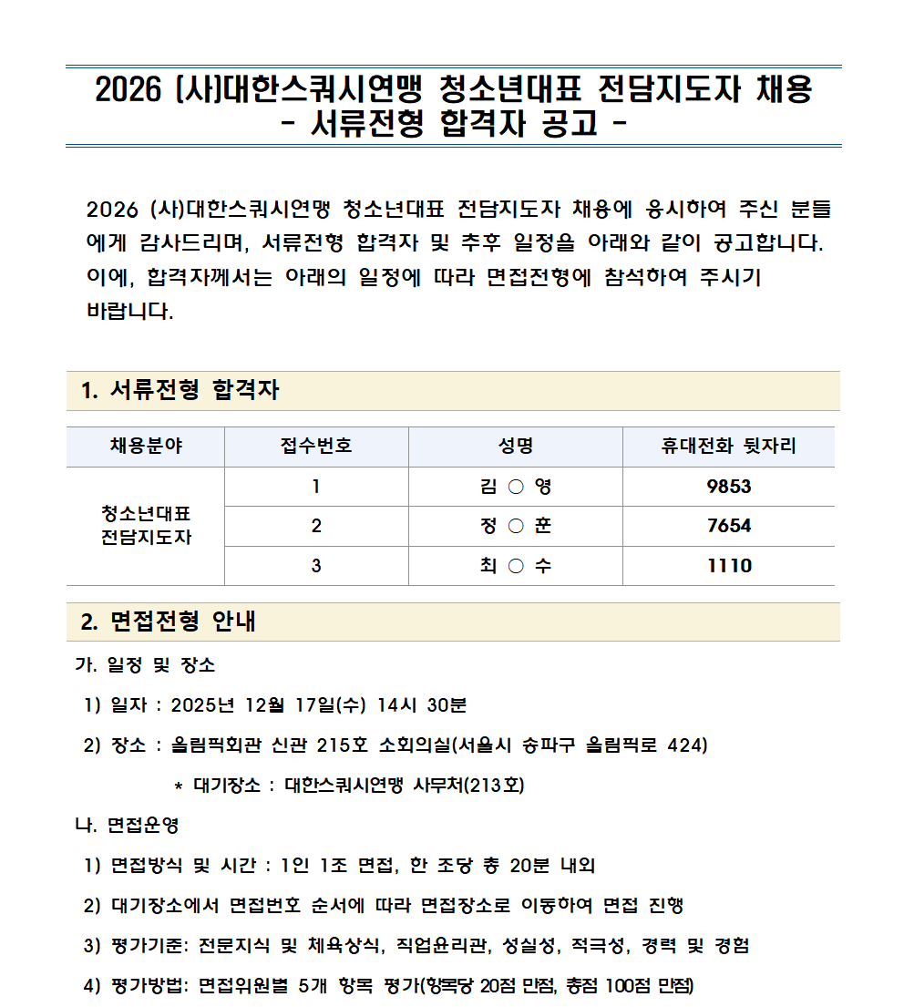 2026 (»ç)´ëÇѽºÄõ½Ã¿¬¸Í û¼Ò³â´ëÇ¥ Àü´ãÁöµµÀÚ °ø°³Ã¤¿ë ¼·ùÀüÇü ÇÕ°ÝÀÚ °ø°í