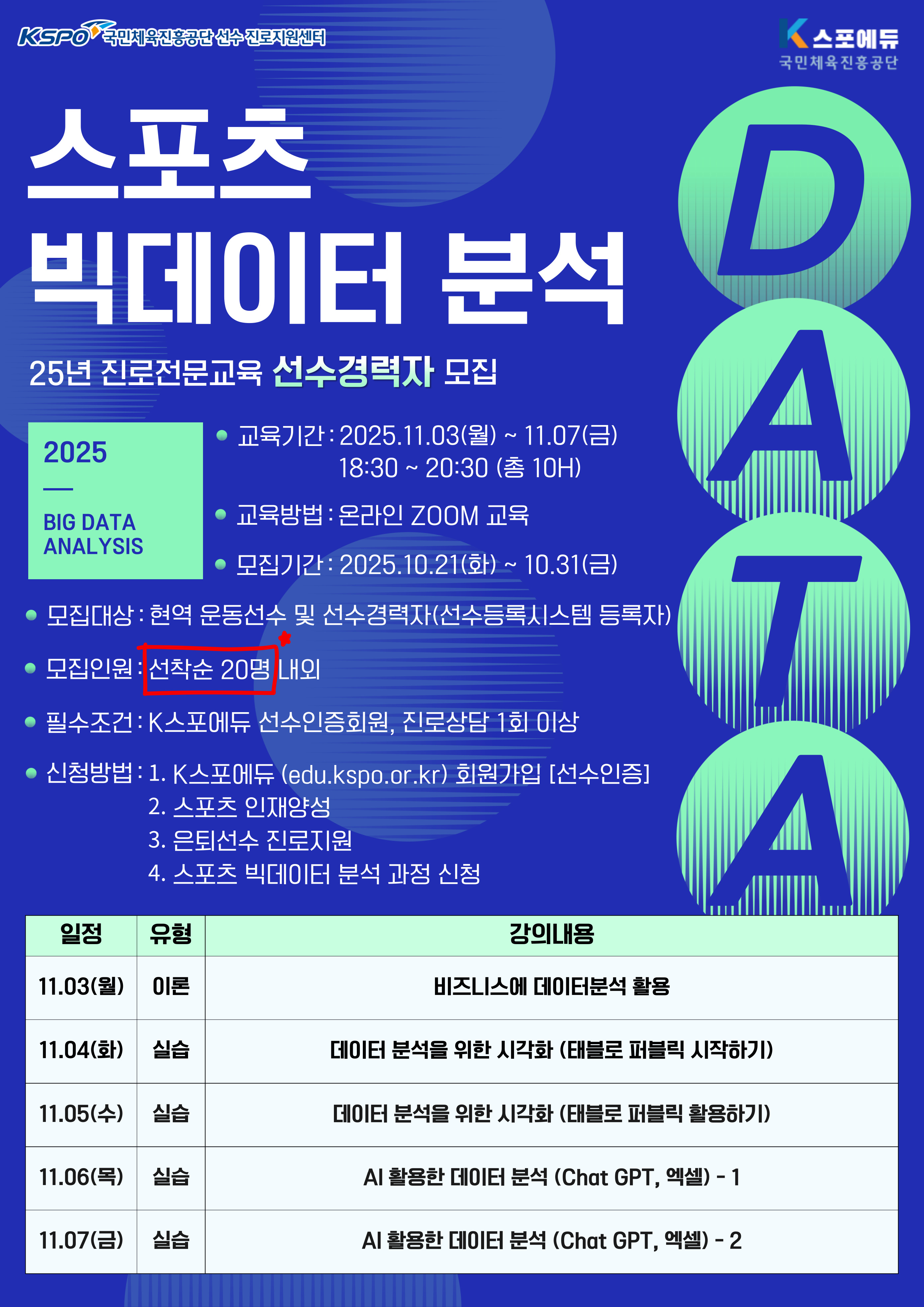 ±¹¹ÎüÀ°ÁøÈï°ø´Ü¿¡¼´Â ¼±¼ö°æ·ÂÀÚ(Çö¿ª ¹× ÀºÅð)µéÀÇ Áø·ÎÁö¿øÀ» À§ÇÏ¿© ´Ù¾çÇÑ ±³À°°úÁ¤À» ¿î¿µÇϰí ÀÖ½À´Ï´Ù. ¼±¼ö°æ·ÂÀÚ¸¦ ´ë»óÀ¸·Î ¡¸2025³â 11¿ù Áø·Î¿ª·®±³À°¡¹À» ¾Æ·¡¿Í °°ÀÌ ¿î¿µÇϰíÀÚ ÇÏ¿À´Ï ¸¹Àº °ü½É ¹Ù¶ø´Ï´Ù. °¡. ±³À°±â°£: 2025³â 11¿ù *±³À°°úÁ¤º° ÀÏÁ¤ »óÀÌ/ ºÙÀÓ ÂüÁ¶ ³ª. ±³À°´ë»ó: ¼±¼ö°æ·ÂÀÚ(Çö¿ª ¹× ÀºÅð) ´Ù. ±³À°°úÁ¤: ½ºÆ÷Ã÷ ºòµ¥ÀÌÅÍ ºÐ¼®, Ãë¾÷Ư°, ½ºÇÇÄ¡ µî ¶ó. ½Åû¹æ¹ý: K½ºÆ÷¿¡µà ȨÆäÀÌÁö ȸ¿ø°¡ÀÔ ÈÄ Èñ¸Á°úÁ¤ ½Åû(¼±¼ö°æ·Â ÀÎÁõ Çʼö)