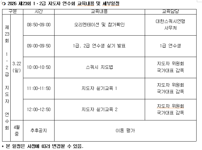 2026 Á¦23ȸ 1¤ý2±Þ ÁöµµÀÚ ¿¬¼öȸ ¿ä° 1. Çà »ç ¸í : 2026 Á¦23ȸ 1¤ý2±Þ ÁöµµÀÚ ¿¬¼öȸ 2. ÀÏ Á¤ - ¿¬ ¼ö ȸ : 2026³â 3¿ù 22ÀÏ(ÀÏ) - ÀÌ·ÐÆò°¡ : 4¿ù Áß (Á¦20ȸ ȸÀå¹è(ÀüºÏ) Àü±¹ ½ºÄõ½Ã ¼±¼ö±Ç´ëȸ ´ëȸ±â°£ Áß) 3. Àå ¼Ò : ±èõÁ¾ÇտÀå »ç°ÝÀå 4. ÁÖ ÃÖ : (»ç)´ëÇѽºÄõ½Ã¿¬¸Í 5. Âü°¡´ë»ó - 1¤ý2±Þ ÁöµµÀÚ ¿¬¼öȸ ¿¬¼ö»ý 2026 Á¦15ȸ 1¤ý2±Þ ÁöµµÀÚ ¿öÅ©¼ó(3¿ù 21ÀÏ(Åä))Àǹ« Âü¼® - ¿öÅ©¼ó Âü°¡½Åû: Âü°¡½Åû ¹Ù·Î°¡±â *¿öÅ©¼ó Âü°¡ºñ Áö¿ø / ¼÷¹Úºñ ¹ÌÁö¿ø - 1±Þ ÁöµµÀÚ ¿¬¼öȸ (1) 23¼¼ ÀÌ»óÀÎ »ç¶÷ (ÇзÂÁ¦ÇÑ ¾øÀ½) (2) 2±Þ ÁöµµÀÚ ÀÚ°Ý Ãëµæ ÈÄ º» ¿¬¸Í ÄÚÄ¡ µî·Ï ±ÔÁ¤¿¡ ÀÇÇØ µî·ÏÇϰí 2³â ÀÌ»ó Ȱµ¿ÇÑ »ç¶÷ (3) ´çÇØ ¿¬µµ ÁöµµÀÚ ¿öÅ©¼ó ¹× 1±Þ ÁöµµÀÚ ¿¬¼öȸ °úÁ¤À» ¼º½ÇÈ÷ À̼öÇÑ »ç¶÷ - 2±Þ ÁöµµÀÚ ¿¬¼öȸ (1) 20¼¼ ÀÌ»óÀÎ »ç¶÷ (ÇзÂÁ¦ÇÑ ¾øÀ½) (2) 3±Þ ÁöµµÀÚ ÀÚ°Ý Ãëµæ ÈÄ º» ¿¬¸Í ÄÚÄ¡ µî·Ï ±ÔÁ¤¿¡ ÀÇÇØ µî·ÏÇϰí 2³â ÀÌ»ó Ȱµ¿ÇÑ »ç¶÷ (3) ´çÇØ ¿¬µµ ÁöµµÀÚ ¿öÅ©¼ó ¹× 2±Þ ÁöµµÀÚ ¿¬¼öȸ °úÁ¤À» ¼º½ÇÈ÷ À̼öÇÑ »ç¶÷ 6. Âü°¡Àοø : 00¸í 7. Âü °¡ ºñ : ½Å±Ô 250,000¿ø / Àç°Ë 50,000¿ø - ³³ºÎ¹æ¹ý : °èÁÂÀÌü / ³³ºÎó: ³³ºÎó: ÇϳªÀºÇà 224-910054-17705, ¿¹±ÝÁÖ: (»ç)´ëÇѽºÄõ½Ã¿¬¸Í * ÀԱݽà º»ÀÎÀ̸§(ÁöµµÀÚ¿¬¼ö) ³»¿ëÀ¸·Î ±âÀç 8. Âü°¡½Åû - ¿¬¼öȸ Âü°¡½Åû¼ À̸ÞÀÏ Á¦Ãâ(koreasquash@sports.or.kr) - Á¢¼ö¸¶°¨ : 2026³â 3¿ù 11ÀÏ(¼ö) 18:00 µµÂø ºÐ¿¡ ÇÑÇÔ - Âü°¡½Åû ½Ã, ¼·ù(½Å±Ô: ÀÚ°ÝÁõ »çº» / Àç°Ë: ¼ö·áÁõ »çº») À̸ÞÀÏ·Î Á¦Ãâ * ¸ÞÀÏÁ¦¸ñ : [2026 Á¦23ȸ 1¤ý2±Þ ÁöµµÀÚ ¿¬¼öȸ Âü°¡½Åû(È«±æµ¿)] 9. ÀڰݰËÁ¤ - 1±Þ: ½Ç±â 50%, °úÁ¦¹° Æò°¡ 30%, ÀÌ·Ð 20% ¨ç ½Ç±â : ½ºÄõ½Ã Áöµµ°ü·Ã ¿¬±¸¹° »çÀü Á¦Ãâ ¹× PPT ¿¬¼öȸ Âü°¡ÀÚ ´ë»ó ¹ßÇ¥ ¨è °úÁ¦¹° Æò°¡ : ¿¬¼öȸ Á¾·á ÈÄ 1ÁÖÀÏ À̳» ¿¬°£ ÈÆ·Ã°èȹ¼ Á¦Ãâ ¨é ÀÌ·Ð : ³í¼úÇü ¹®Á¦ ÃâÁ¦ - 2±Þ: ½Ç±â 50%, °úÁ¦¹° Æò°¡ 30%, ÀÌ·Ð 20% ¨ç ½Ç±â : ÇǵùÅ×½ºÆ®(¿µ»ó¹° Á¦Ãâ) ¨è °úÁ¦¹° Æò°¡ : ¿¬¼öȸ Á¾·á ÈÄ 1ÁÖÀÏ À̳» ¿ù°£ ÈÆ·Ã°èȹ¼ Á¦Ãâ ¨é ÀÌ·Ð : ´Ü´äÇü ¶Ç´Â ¼¼úÇü ¹®Á¦ ÃâÁ¦ 10. ±âŸ»çÇ× - Áغñ¹° : Çʱ⵵±¸, »çÁø(3*4 ¹Ý¸íÇÔÆÇ) 2¸Å - ¹® ÀÇ Ã³ : (»ç)´ëÇѽºÄõ½Ã¿¬¸Í(02-419-6454)